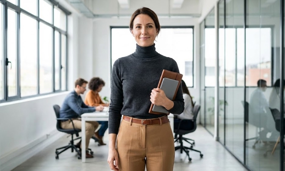 Zaboravite na uštogljena odela; moderno poslovanje voli udobnost. Kombinujte tanji džemper od kašmira ili fine vune sa krojenim pantalonama visokog struka.